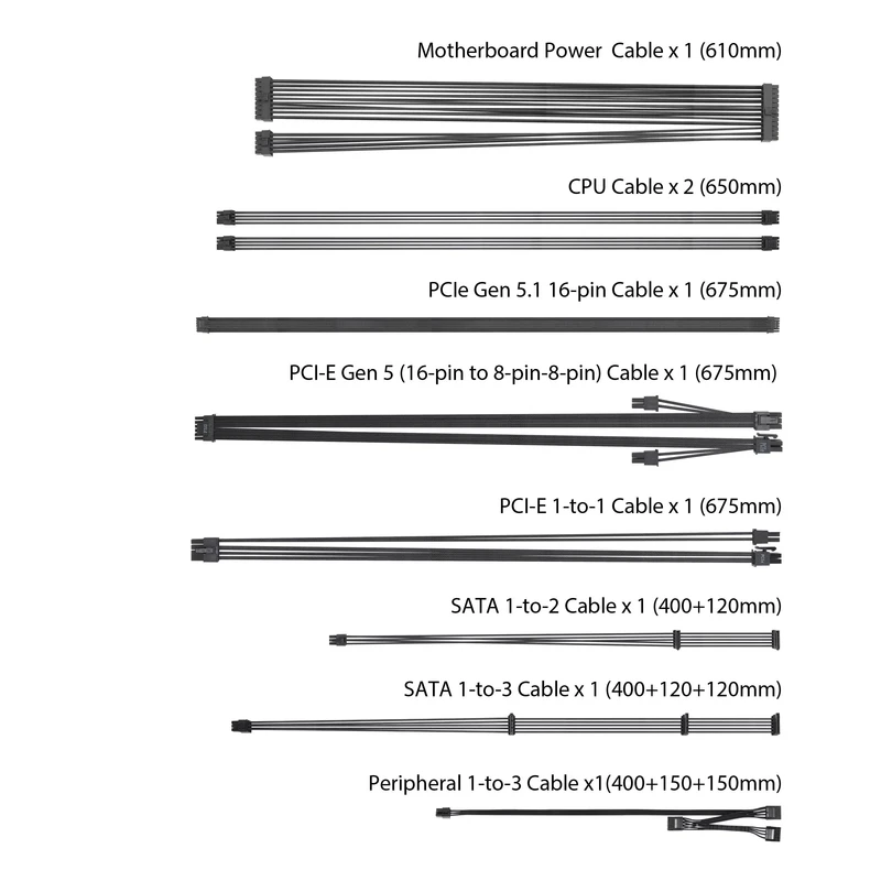 | نوع کانکتورها | یک کانکتور 24 پین مادربرد دو عدد 4+4 پین CPU/EPS چهار تا شش عدد 6+8 پین PCI-E مخصوص کارت گرافیک چندین کانکتور SATA و Molex برای ذخیرهسازها و فنها |